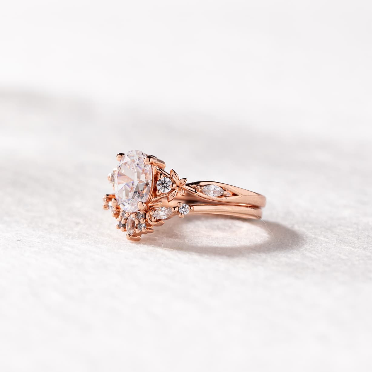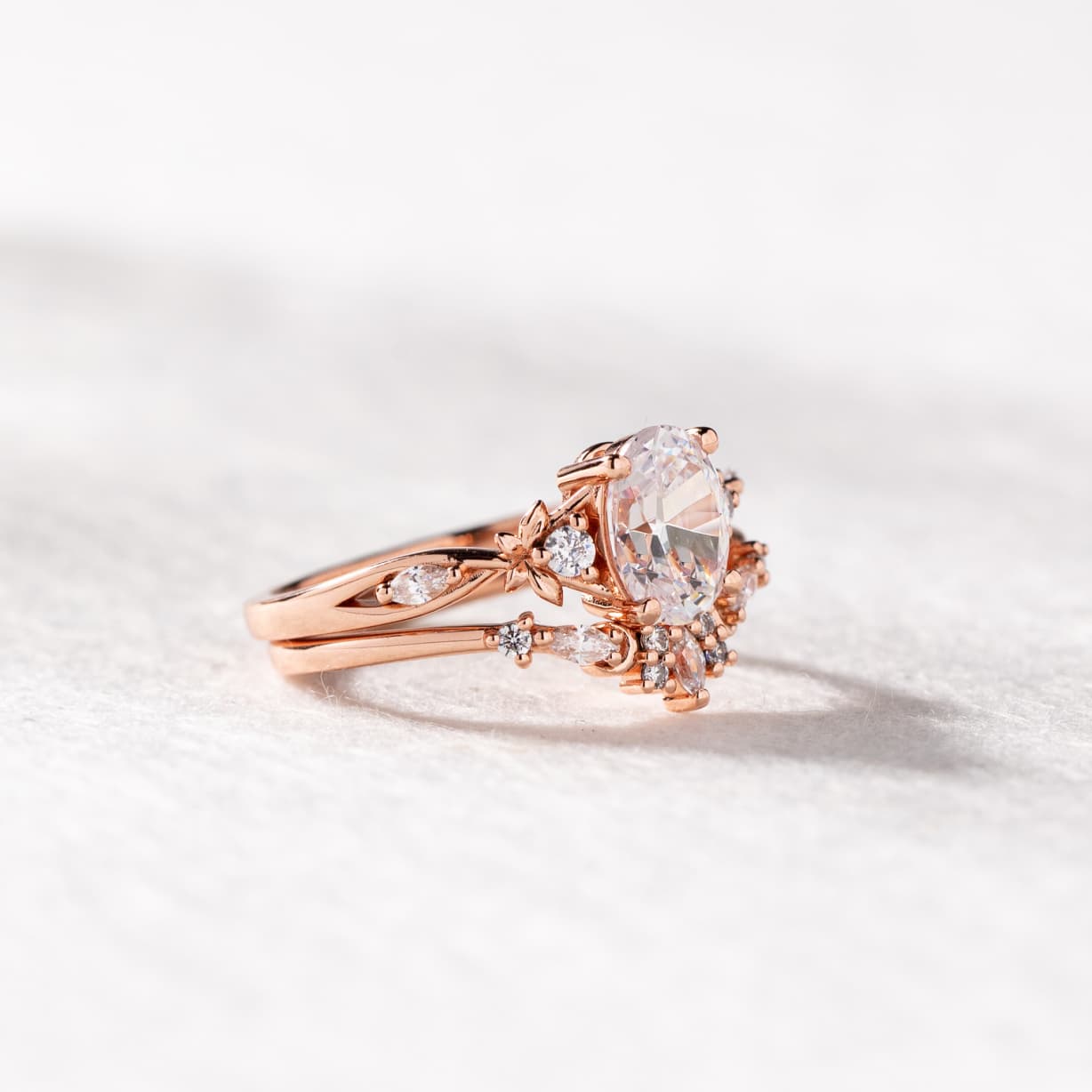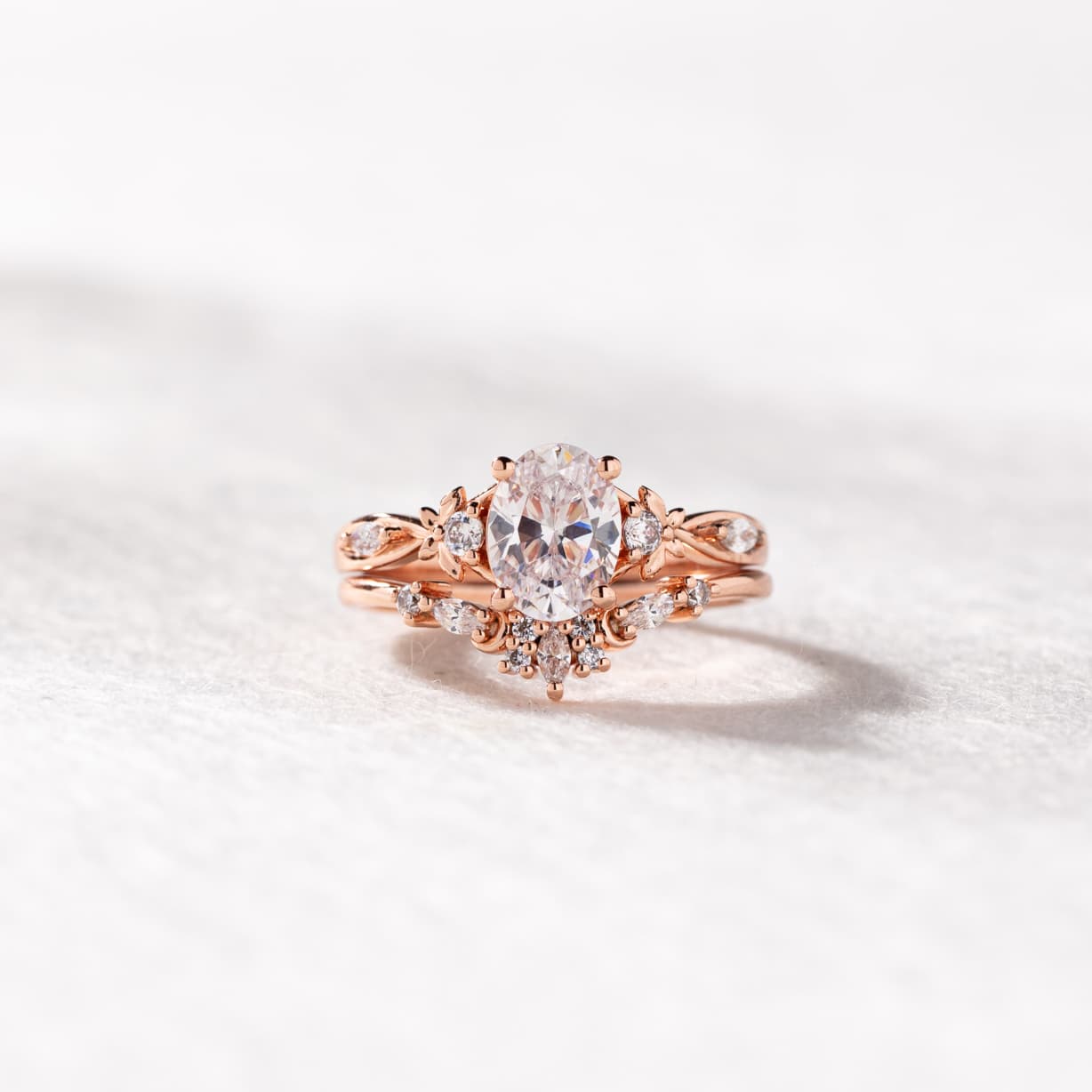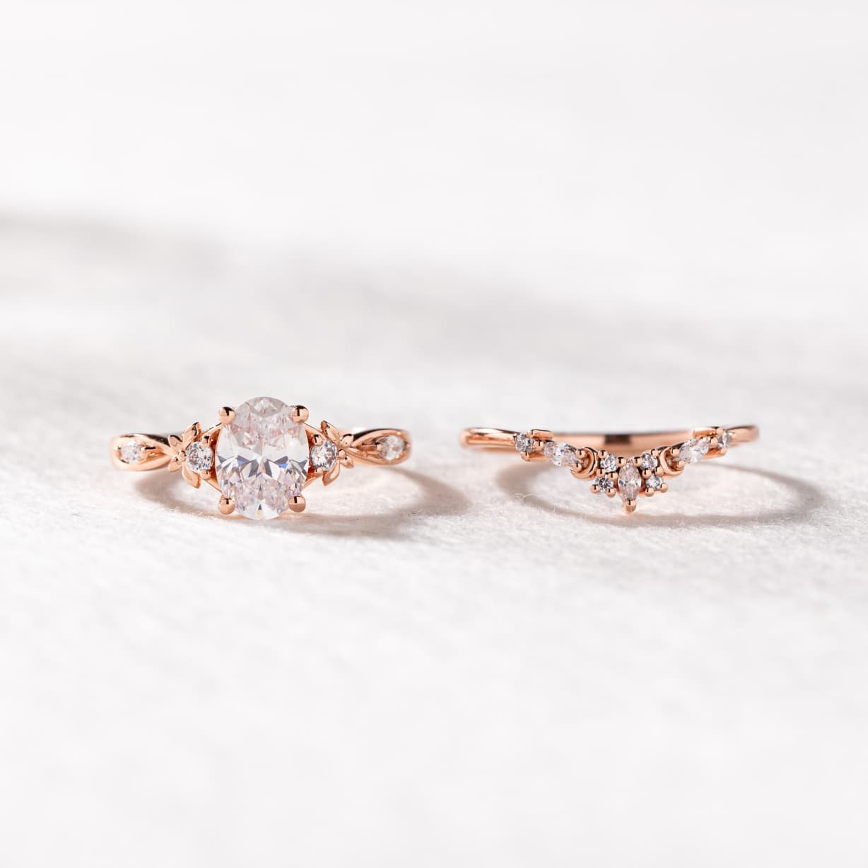 A romantic, nature-inspired wedding ring featuring a Oval cut Moissanite stone, glowing with subtle iridescence and ethereal beauty. 🌙✨